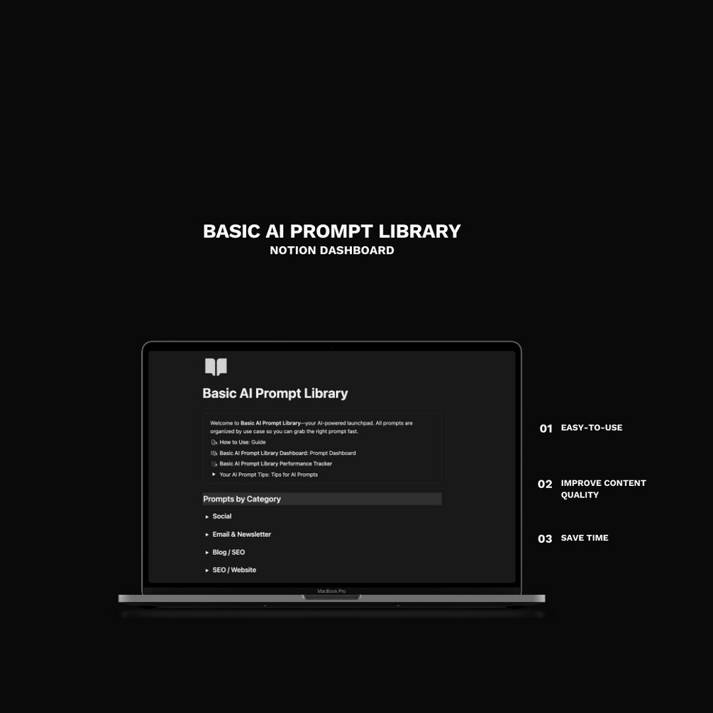 The Basic AI Prompt Library gives you 50+ plug-and-play prompts organized by channel and use case—so you always know exactly what to ask your AI tool to get high-quality results.