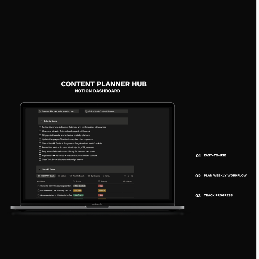 Content Planner Hub gives you a complete system for brainstorming ideas, planning weekly content, structuring posts for every platform, tracking your publishing schedule, and staying consistent with less stress.